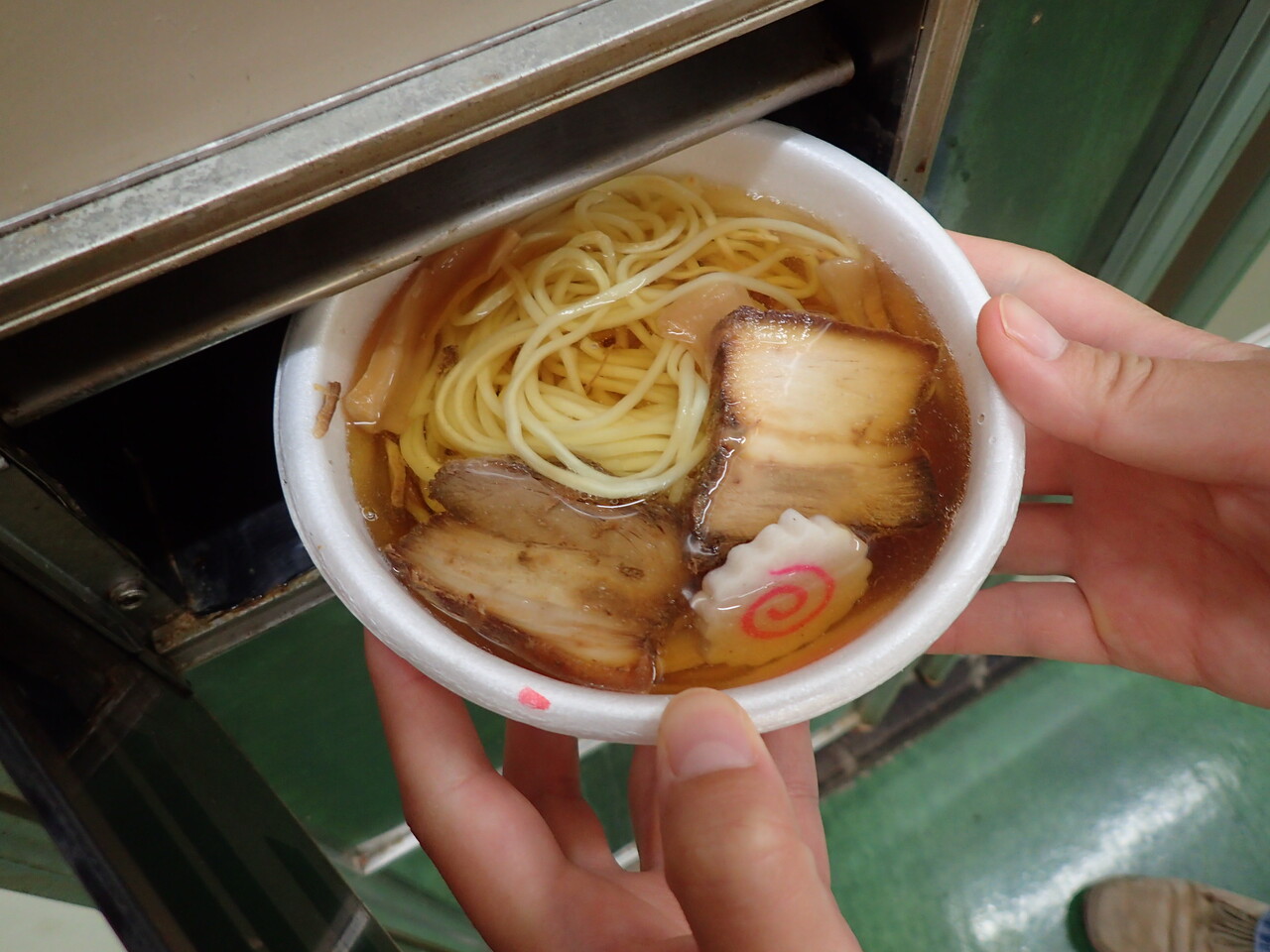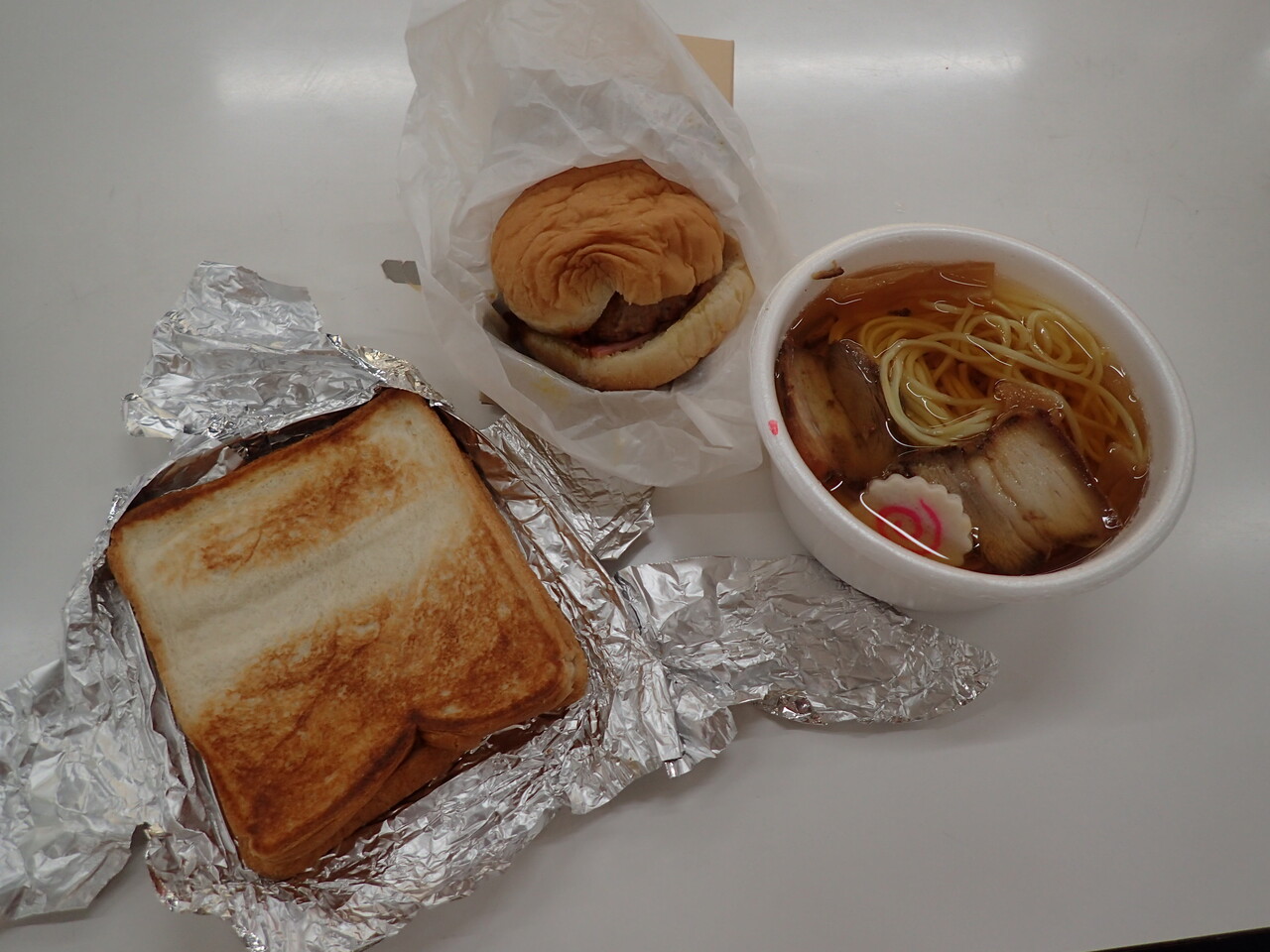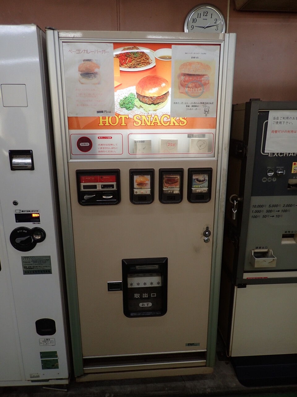 寒い冬の深夜、自販機のハンバーガーとそばを食べました。